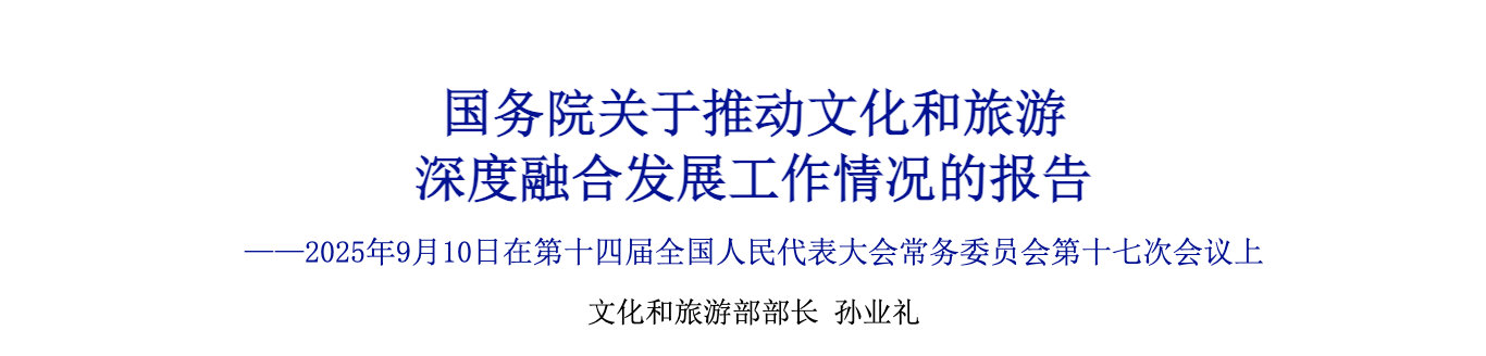 2025年9月10日,《国务院关于推动文化和旅游深度融合发展工作情况的报告》提请十四届全国人大常委会第十七次会议审议,文化和旅游部部长孙业礼作报告。推动文化和旅游深度融合,是党中央作出的重大决策,对于